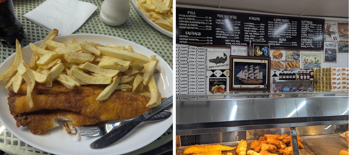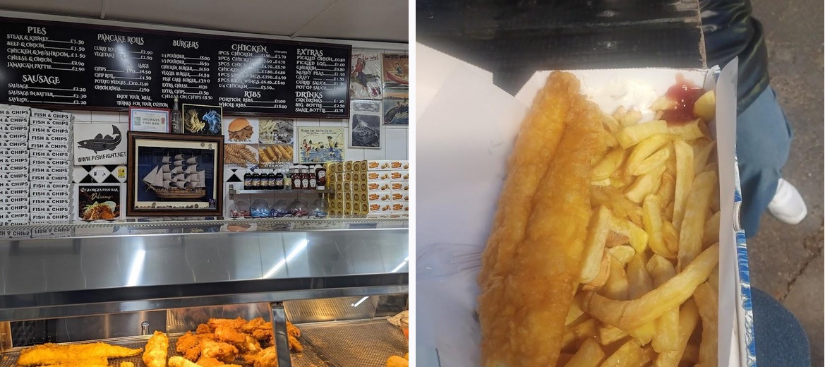 George's Fish Bar offers a wide variety of options including cod, haddock, burgers, pies, and tasty extras like mushy peas and curry sauce.
